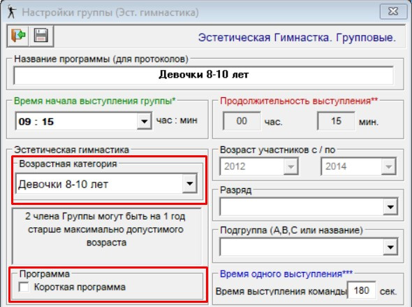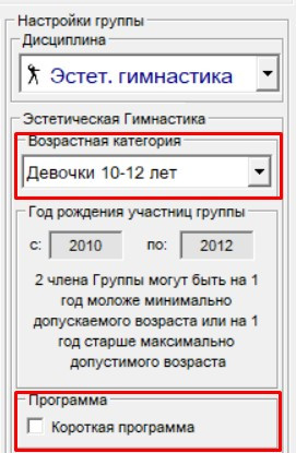 После выбора дисциплины появится окошко, в котором вы можете выбрать возрастную категорию участниц и вид программы: