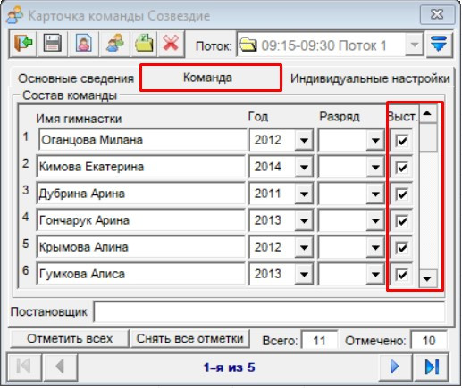 Максимальное количество участниц - 15. Участниц, выступающих в конкретном упражнении можно будет отметить или откорректировать уже в главном окне, в карточке команды на закладке "Команда":