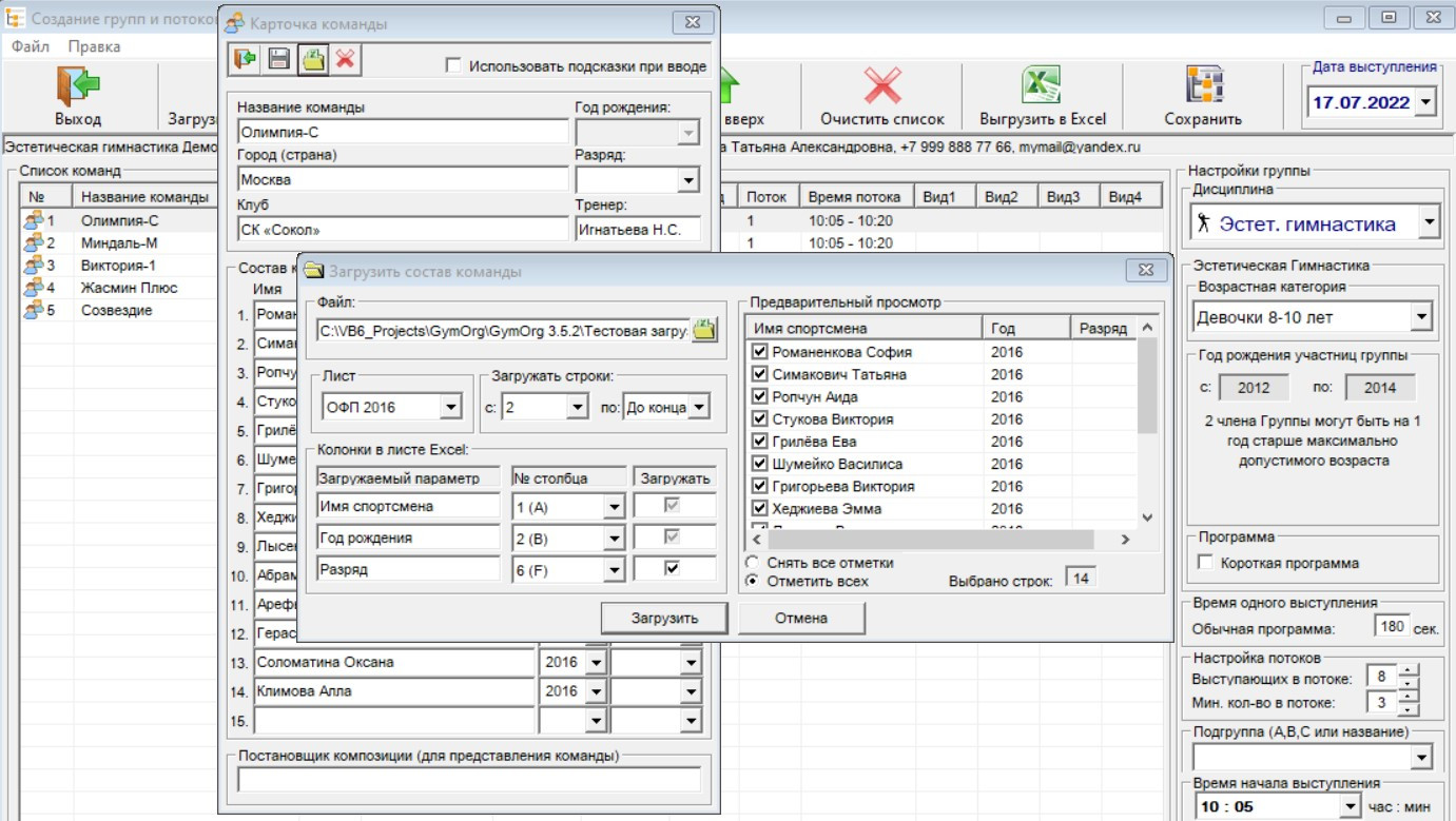 Список участников загружается так же, как и групповые в Художественной Гимнастике. То есть сначала мы вводим только названия команд (вручную или из файла Excel), а потом вводим список участниц команды, опять же из Excel или вручную: