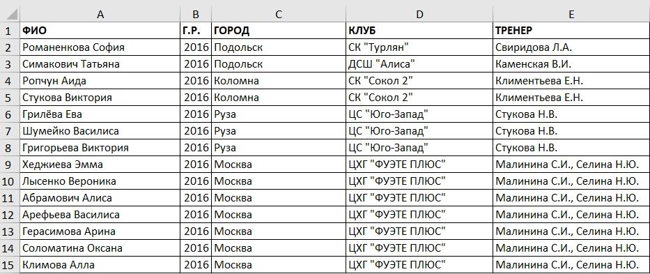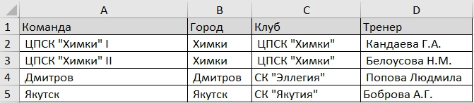 Для групповых упражнений изначально загружаются только названия команд (пример):