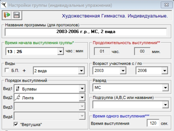 Укажите виды (предметы), с которыми будет выступать группа и выполните остальные настройки (год, время одного выступления, и т.д.)