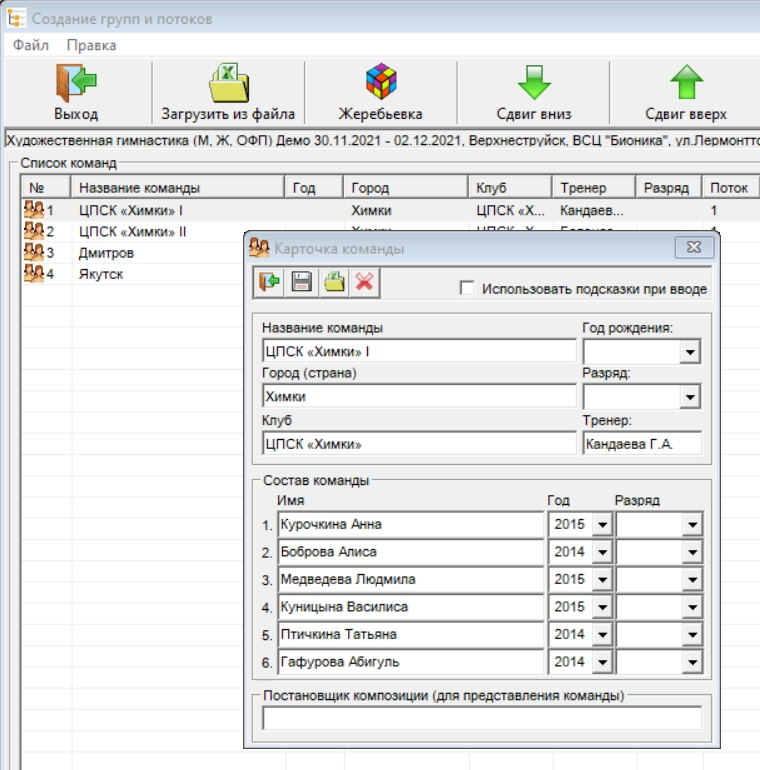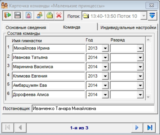 Состав команды можно ввести (вручную или из файла) в карточке команды в форме создания групп и потоков или позже, в главном окне в карточке команды (закладка "Команда"):