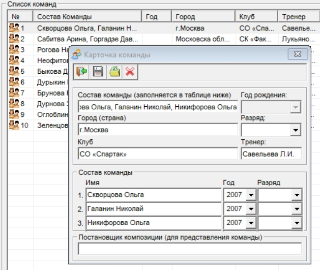 В случае необходимости вы сможете изменить состав группы в главном окне соревнования, в карточке команды на закладке "Команда":