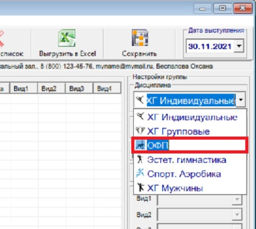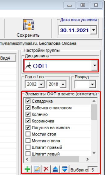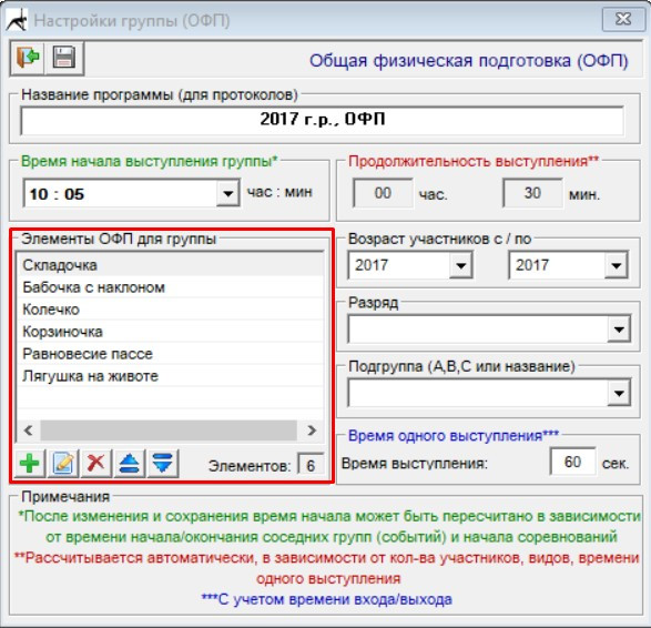 После выбора дисциплины появится окошко, в котором вы можете определить состав элементов ОФП, добавить, удалить, переименовать элементы: