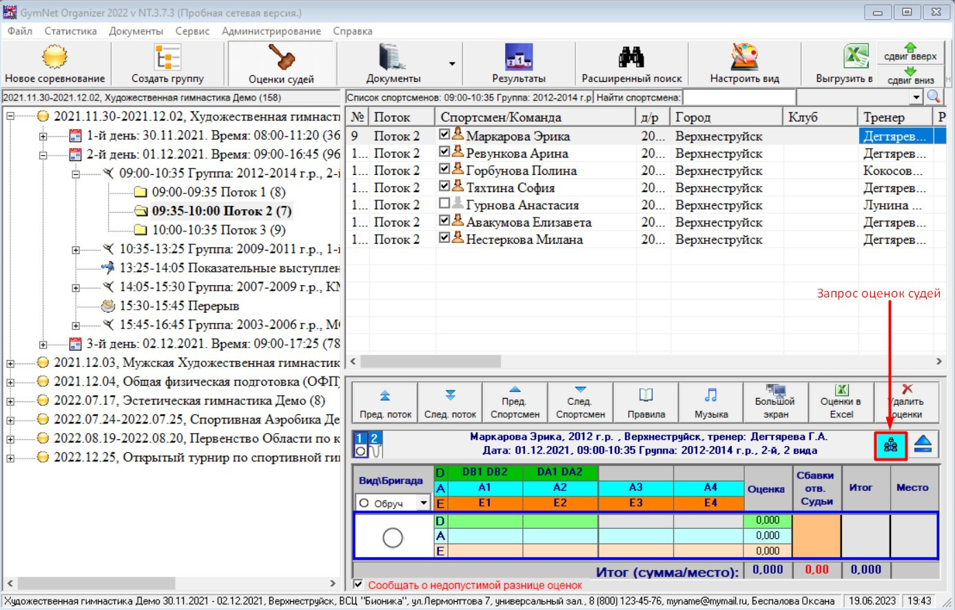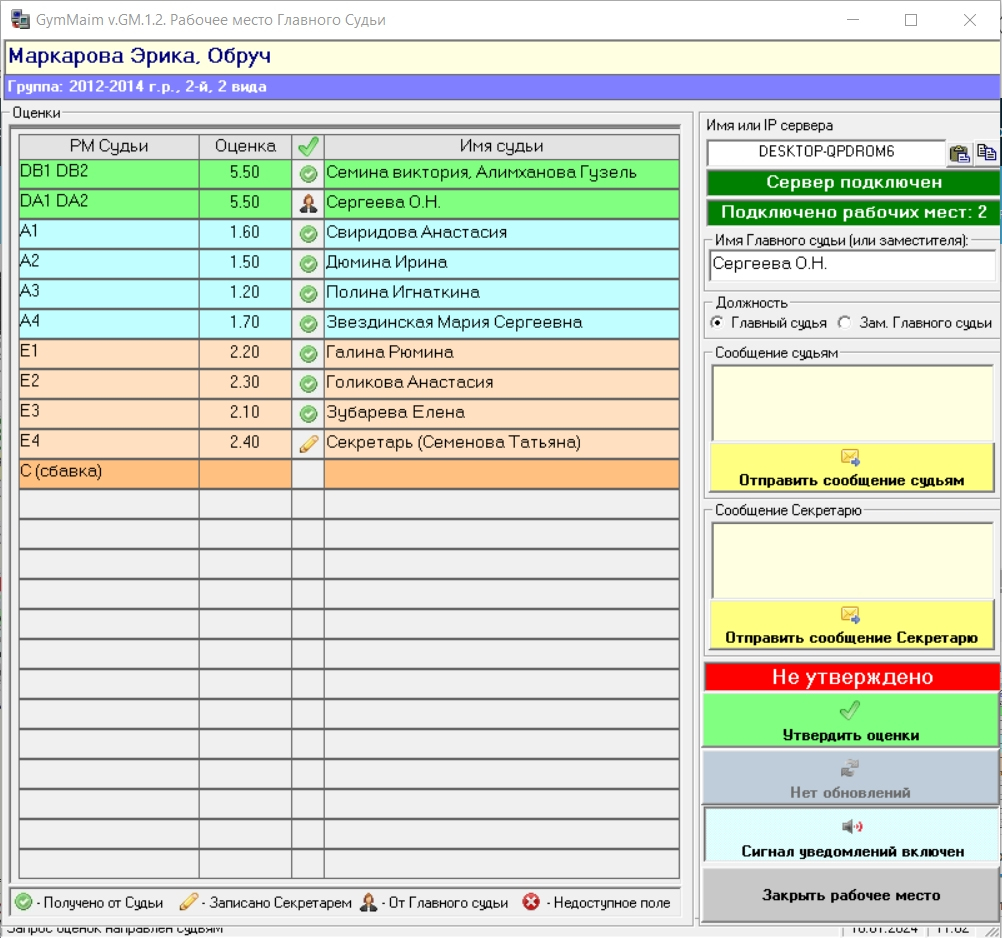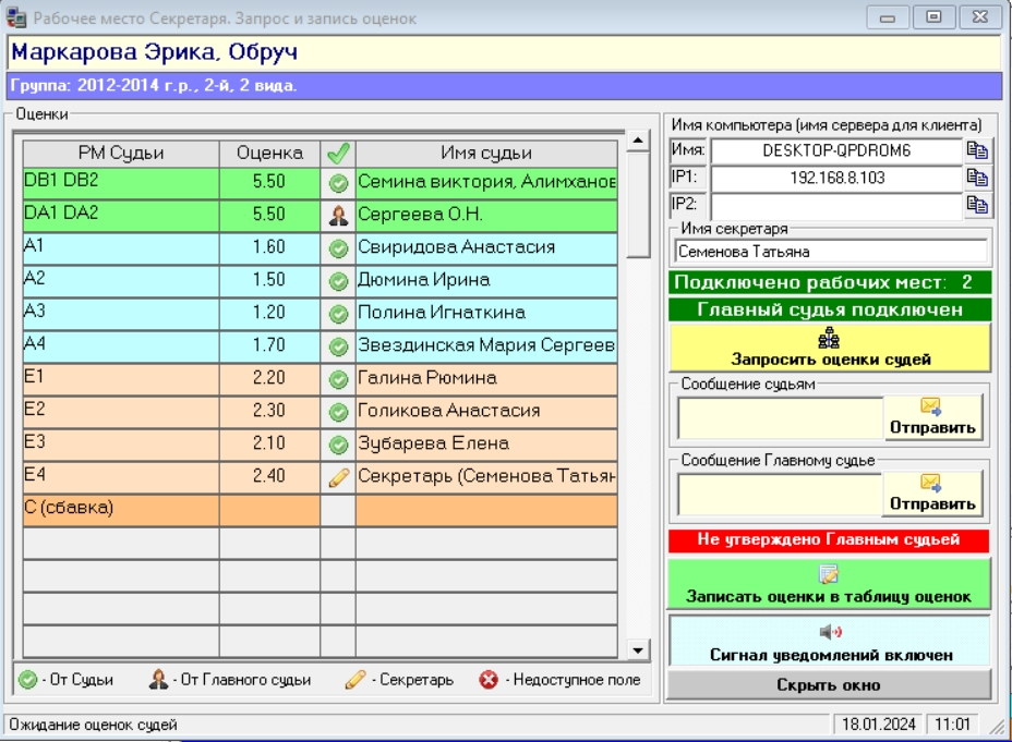 В сетевой версии предусмотрена возможность подключения удаленных рабочих мест Судей для выставления оценок спортсменам и рабочего места Главного судьи для контроля и утверждения оценок, с возможностью их корректировки.