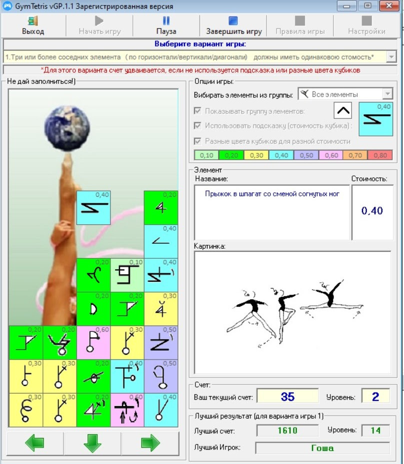 Правила игры чрезвычайно просты – как и в любом тетрисе вам надо постараться как можно дольше не дать «стакану» заполнится «кубиками». Кубик представляет собой значок элемента из Правил по Художественной Гимнастике на 2022-24г.
