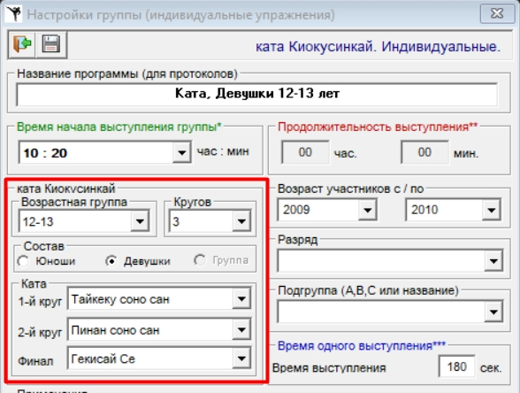 После выбора дисциплины появится окошко, в котором вы можете выбрать вид (индивидуальные, ката-группа), определить возрастную группу участников, установить состав (м, ж, группа), указать количество кругов 2 или 3 (2 круга +финал), установить ката для каждого круга.