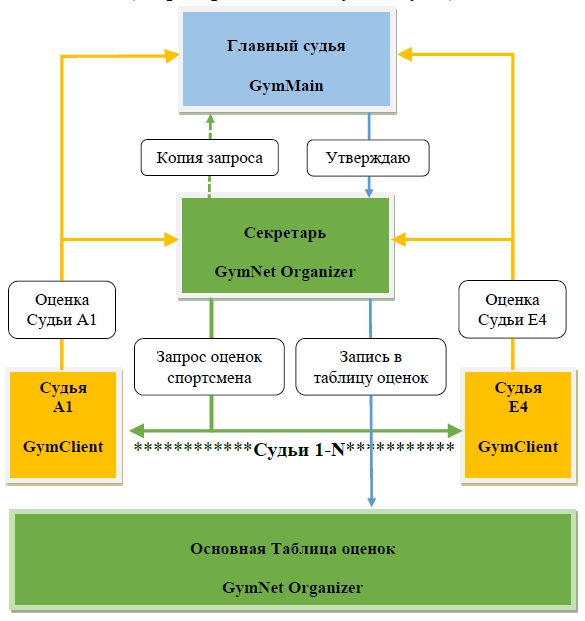 Сетевая версия состоит из Серверной части (рабочее место Секретаря - собственно программа GymNetOrganizer), Клиентской части (рабочие места Судей – программа GymClient) и рабочее места Главного судьи (программа GymMain). Количество подключенных рабочих мест Судей не ограничено. Рабочих мест Главного судьи так же может быть несколько, например Главный судья + Заместитель или Помощник. Функциональность и Права Гланого судьи и заместителя одинаковые, они могут просматривать, корректировать, и утверждать оценки выставленные судьями. (в принципе, использование РМ Главного судьи не является обязательным, если оно вам не нужно, программный комплекс будет исправно работать и без него).