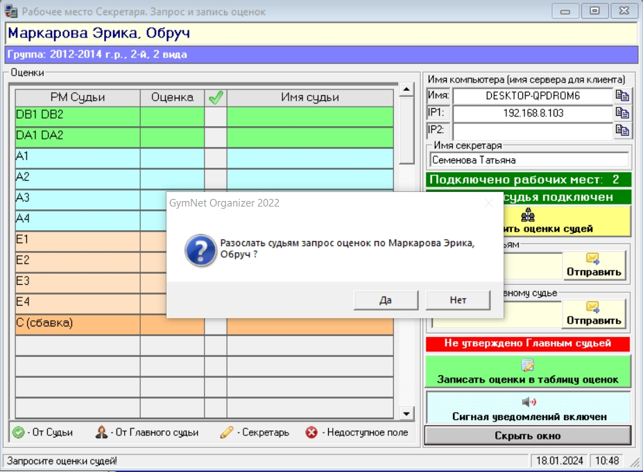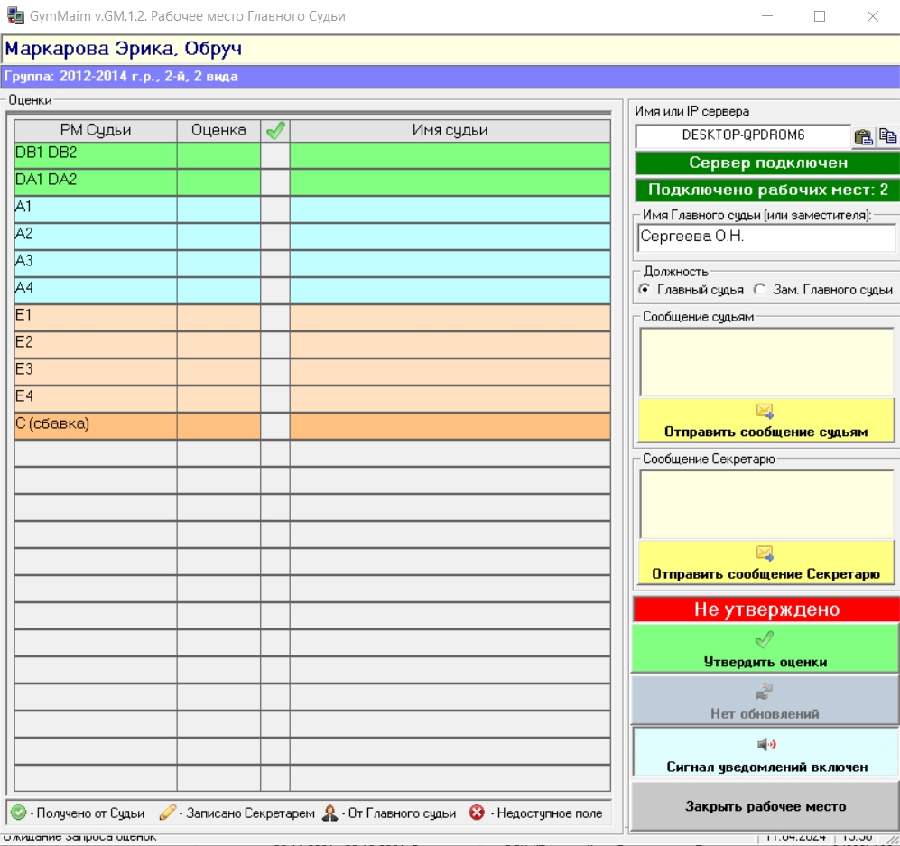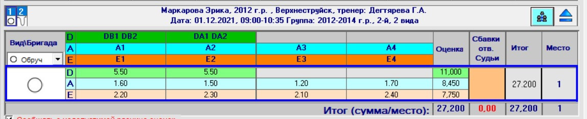 В сетевой версии предусмотрена возможность подключения удаленных рабочих мест Судей для выставления оценок спортсменам и рабочего места Главного судьи для контроля и утверждения оценок, с возможностью их корректировки.