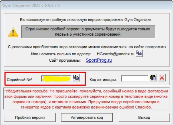 Прежде чем приобрести программу, настоятельно рекомендуем ознакомиться с описанием, посмотреть видеоролики, проверить, правильно ли отображается шрифты, корректно ли формируются документы, попробовать поработать с пробной версией, создать свое соревнование, проверить загрузку спортсменов из файла Excel, и только после этого принимать решение о покупке или сообщить нам о возникшей проблеме. Все перечисленное можно проверить в демо-режиме, без кода активации.